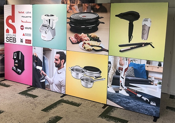 Med bildväggar och golvdekaler kan du utmärka delar och skapa ”rum i rummet” på ett visuellt tilltalande sätt. Beroende på event, utrymme eller behov kan du variera din bildvägg. Ena dagen har man kanske en lång rak vägg, för att nästa dag befinna sig i en minde lokal och istället bygga pelare på höjden. På ett tredje event kanske man använder samma ramar för att bygga en vinkel. Bildväggar är ofta lämpade för dubbelsidiga tryck dessutom, så du kan använda kommunikationen på båda sidorna på ett kreativt sätt.