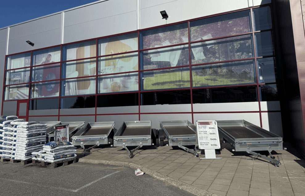 Utvändigt uppdaterades butikerna med nya skyltar anpassade efter K-Byggs visuella identitet. Skyltningen spelar en avgörande roll i all butiksomprofilering, inte minst inom byggvaruhandeln där synlighet och tydlighet ofta är avgörande för kundens val. För att ytterligare förstärka helhetsintrycket folierades även fönsterkarmarna. Det skapade ett mer sammanhållet uttryck där fasad, skyltar och detaljer samverkar och tydligt signalerar den nya profilen – både på nära håll och på avstånd.