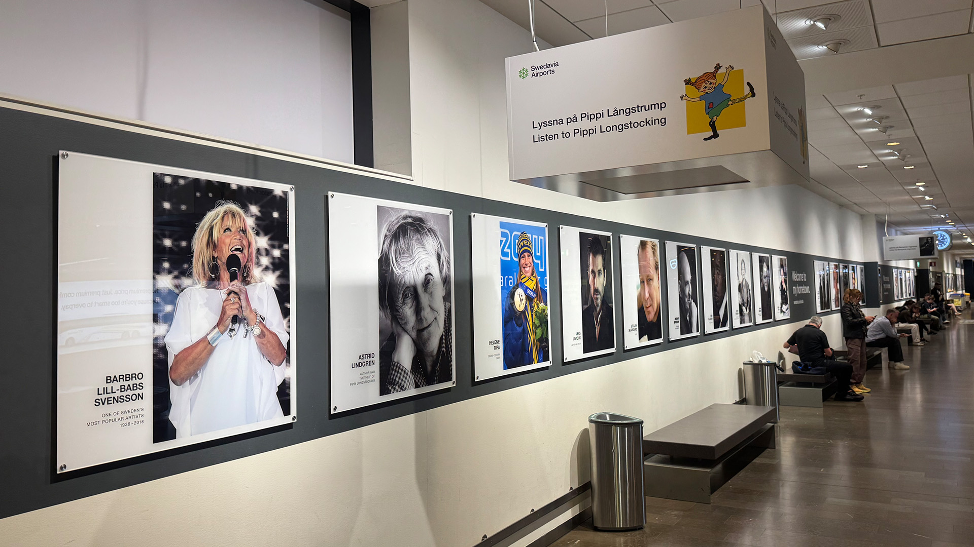 Du som har besökt Arlanda har säkert sett de välkända vita skyltarna på kända svenskar som finns i utrikesterminalerna. Parallellt med arbetet för Marknadsplatsen har vi även tagit fram nya tavlor till just denna utställning, som officiellt är benämnd Stockholm Hall of Fame, eller Welcome To My Hometown. Utställningen är en permanent del av utrikesterminalerna och fungerar som en personlig välkomsthälsning till resenärer från hela världen.