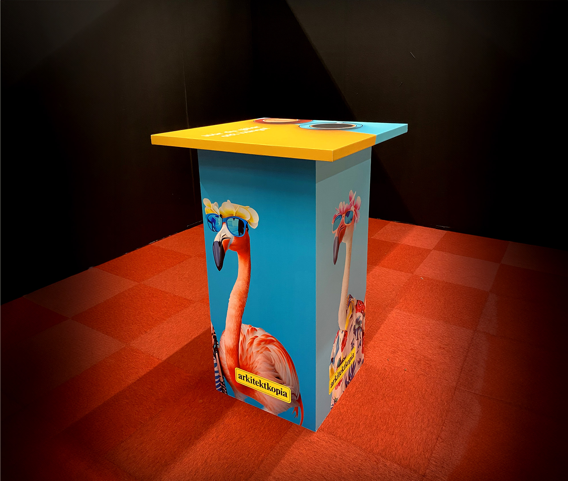 Designa din helt egen monterdisk eller podium och tryck på alla sidor med våra modeller tillverkade i ett tjockt och kartongliknande pappersfibermaterial som är 100% återvinningsbart och som går bra att återanvända vid flera tillfällen. Det innovativa materialet är hårt, tåligt och kan figurskäras. Välj mellan våra standardstorlekar eller kontakta oss för en anpassad lösning.