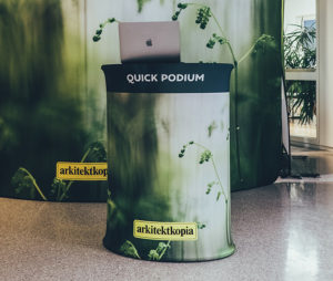 Vi vågar nog påstå att det aldrig har varit enklare än så här att skapa en samlingspunkt i en monter. Pop-up disk är försett med gasdämpare vilket innebär att när tygvåden är monterad på bordet kan man med ett enkelt handtryck fälla upp och ner bordet med textilen på. Paketet innehåller komplett ställning och tyg med silikonlist. Podiet klarar max 10 kg belastning. Finns i en standardstorlek och en större storlek.