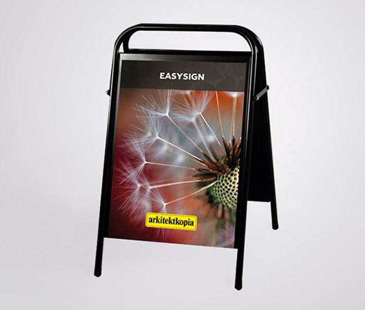Denna gatupratare är ett så kallat A-ställ, även det försett med magnetfönster för enkel montering av affischerna. Easy Sign kommer i samma storlekar som City Sign (50×70 och 70×100 cm) och du kan välja mellan fyra färger: